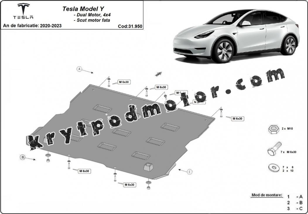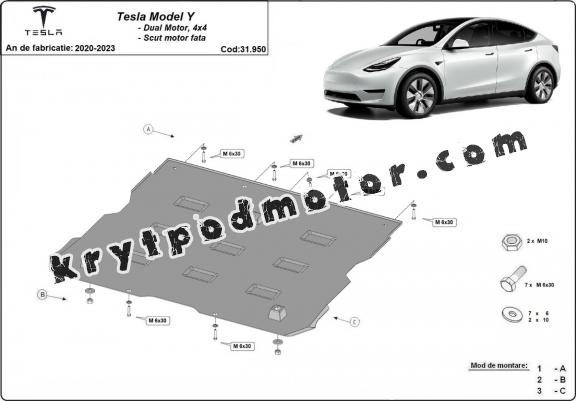| Kryt pod motor je nová a dokonale se hodí pro Tesla Model Y AWD, s následujícími verzemi motor / pohon: Dual Motor - vyráběné v letech 2020 až 2023. |