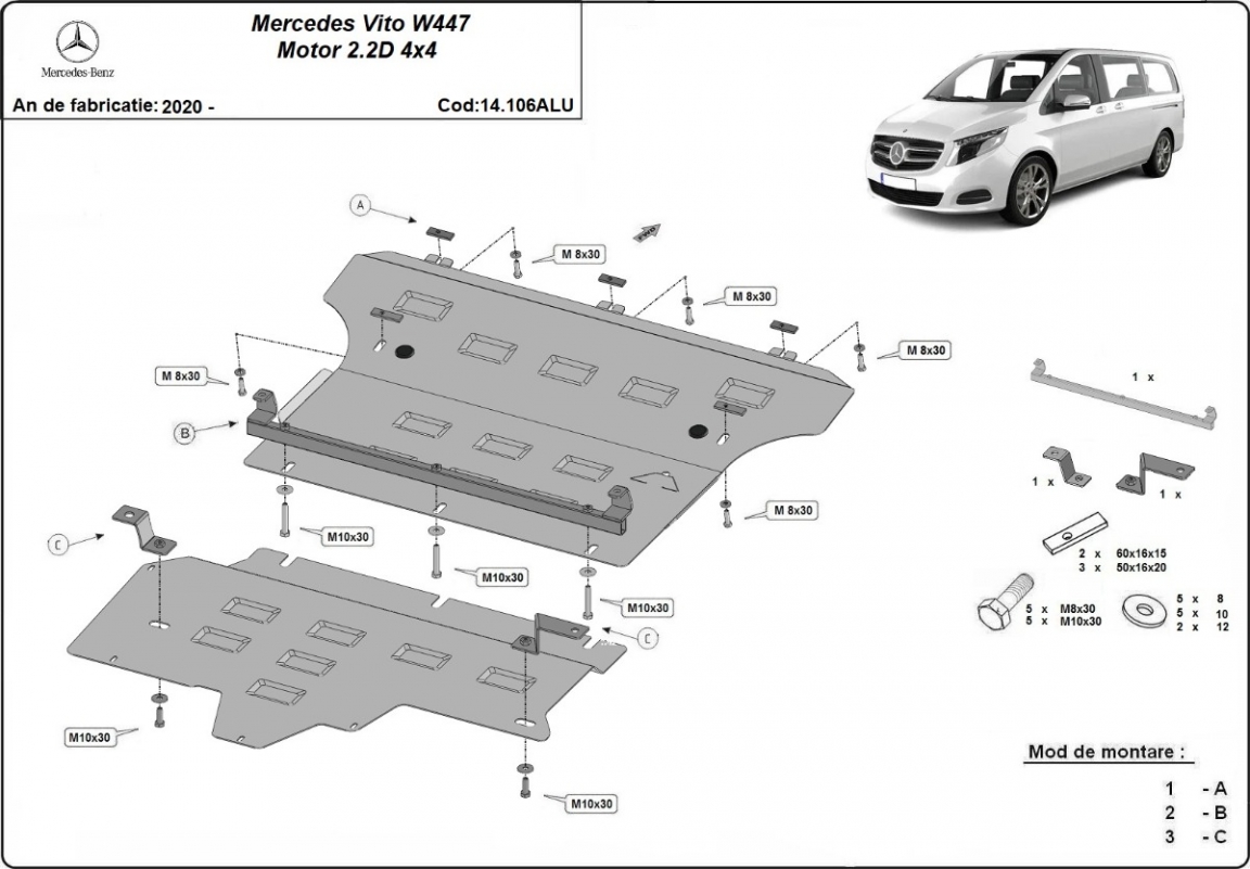 | Kryt pod motor je nová a dokonale se hodí pro Mercedes Vito W447, s následujícími verzemi motor / pohon: 2.0, 2.2 D, 4x4 - vyráběné v letech 2020 až 2026. |
