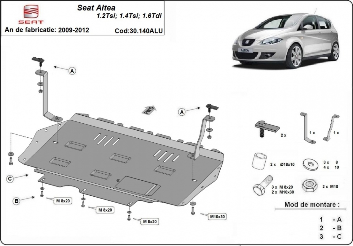 | Kryt pod motor je nová a dokonale se hodí pro Seat Altea, s následujícími verzemi motor / pohon: 1.2Tsi, 1.4Tsi, 1.6Tdi - vyráběné v letech 2009 až 2012. |