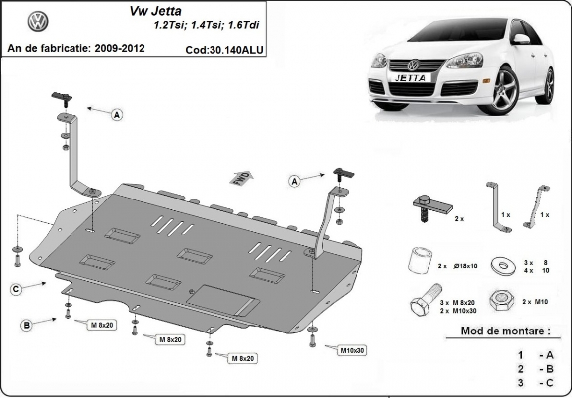 | Kryt pod motor je nová a dokonale se hodí pro VW Jetta, s následujícími verzemi motor / pohon: 1.2Tsi, 1.4Tsi, 1.6Tdi - vyráběné v letech 2009 až 2012. |