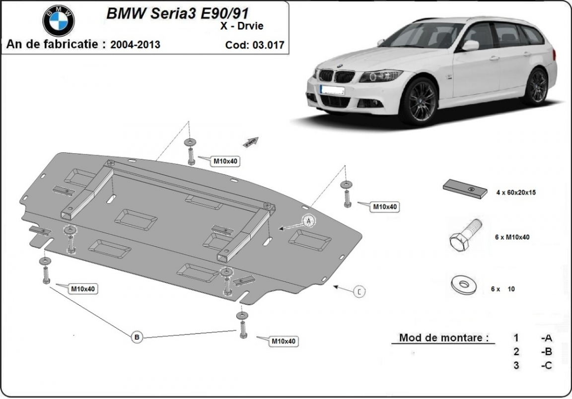 | Kryt pod motor je nová a dokonale se hodí pro BMW seria 3 - E90, s následujícími verzemi motor / pohon: XDrive - vyráběné v letech 2004 až 2013. |