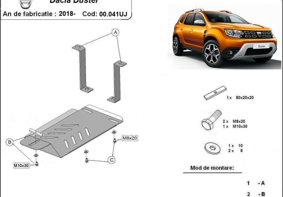 | Kryt pod motor je nová a dokonale se hodí pro Dacia Duster, s následujícími verzemi motor / pohon: 4x4 - vyráběné v letech 2018 až 2024. |