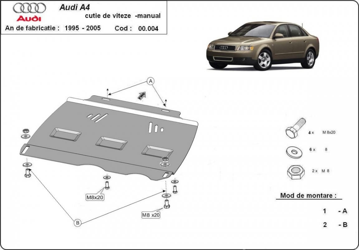 | Kryt pod motor je nová a dokonale padne pro všechny verze Audi A4 B6 - manuelle vyrobené v letech 2000 až 2005. |