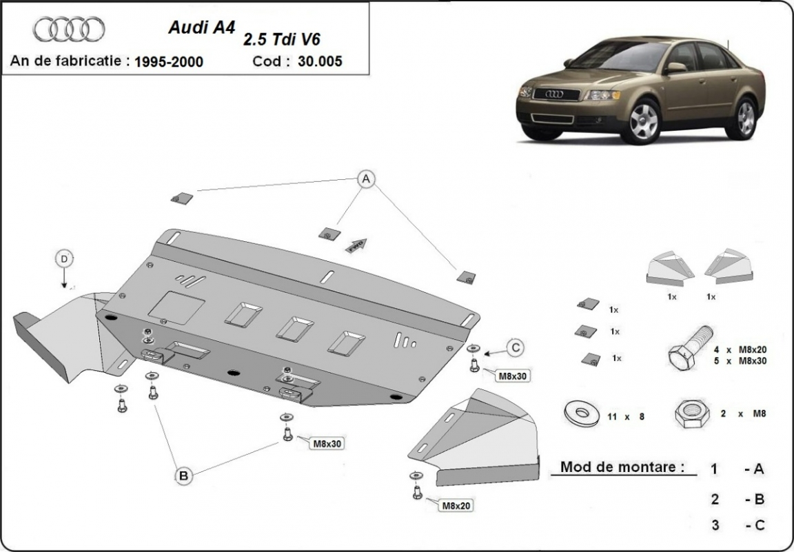 | Kryt pod motor je nová a dokonale se hodí pro Audi A4 B5, s následujícími verzemi motor / pohon: petrol V6, 2.6, 2.8, diesel - 2.5 D - vyráběné v letech 1997 až 2000. |