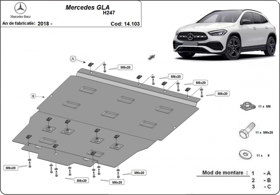 | Kryt pod motor je nová a dokonale padne pro všechny verze Mercedes GLA H247 vyrobené v letech 2019 až 2026. |