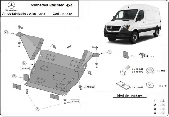 | Kryt pod motor je nová a dokonale se hodí pro Mercedes Sprinter 4x4, s následujícími verzemi motor / pohon: 4x4 - vyráběné v letech 2006 až 2018. |