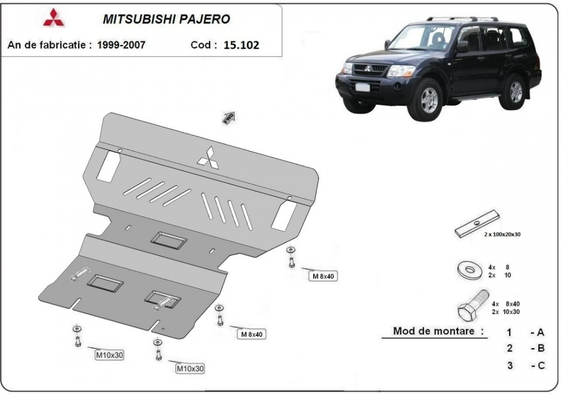 | Kryt pod motor je nová a dokonale se hodí pro Mitsubishi Pajero 3 (V60, V70), s následujícími verzemi motor / pohon: 3.5 Gdi; 2.5 Tdi; 3.2 Di-d - vyráběné v letech 1999 až 2007. |