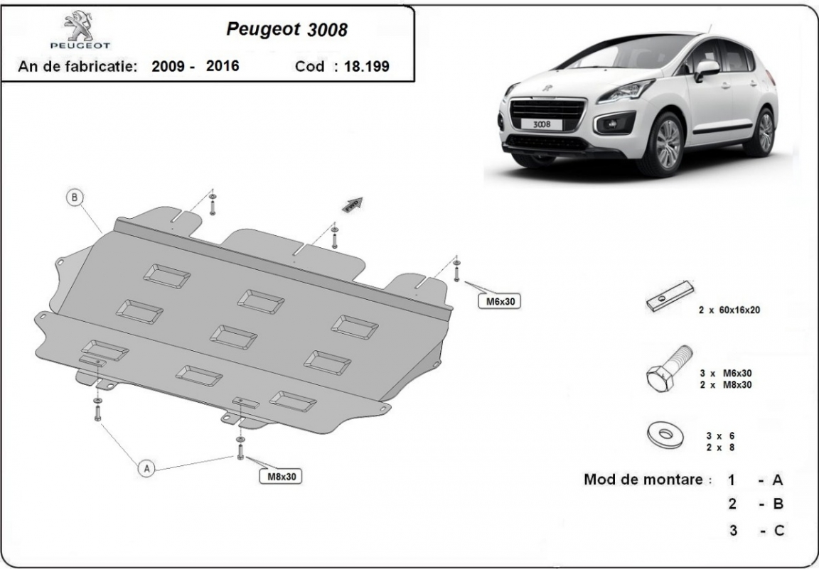 | Kryt pod motor je nová a dokonale padne pro všechny verze Peugeot 3008 vyrobené v letech 2009 až 2016. |
