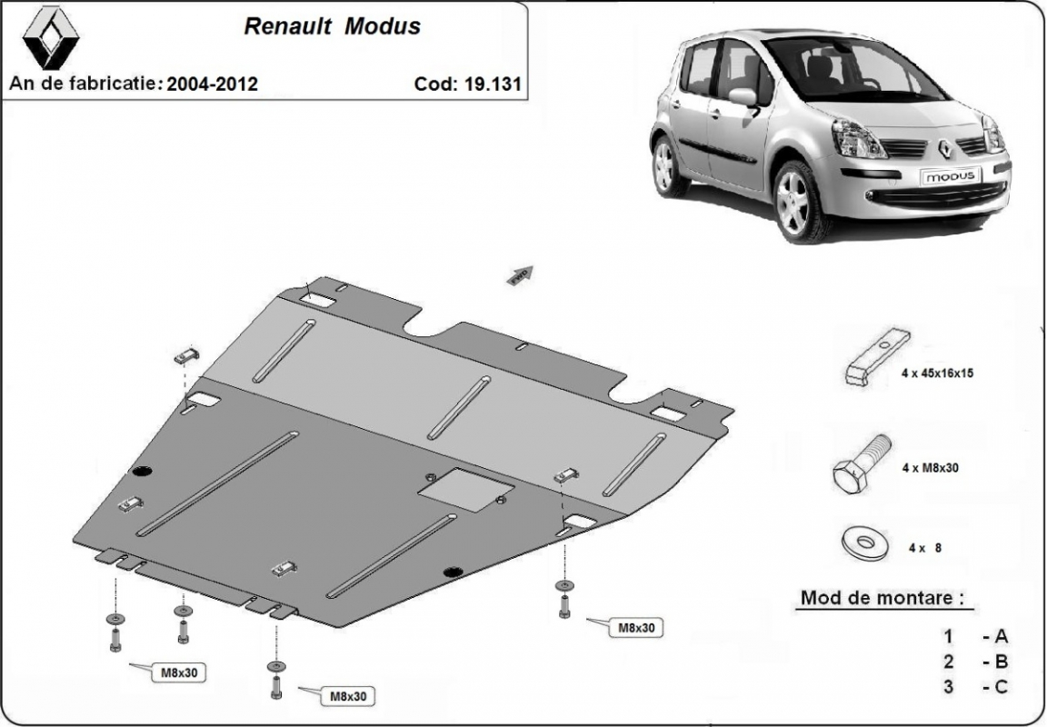 | Kryt pod motor je nová a dokonale padne pro všechny verze Renault Modus vyrobené v letech 2004 až 2012. |