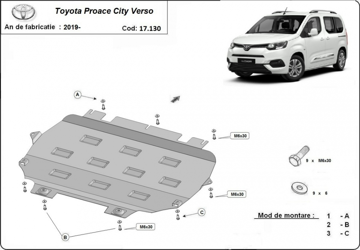| Kryt pod motor je nová a dokonale se hodí pro Toyota Proace City, s následujícími verzemi motor / pohon: 1.2 petrol, 1.5 diesel - vyráběné v letech 2019 až 2026. |