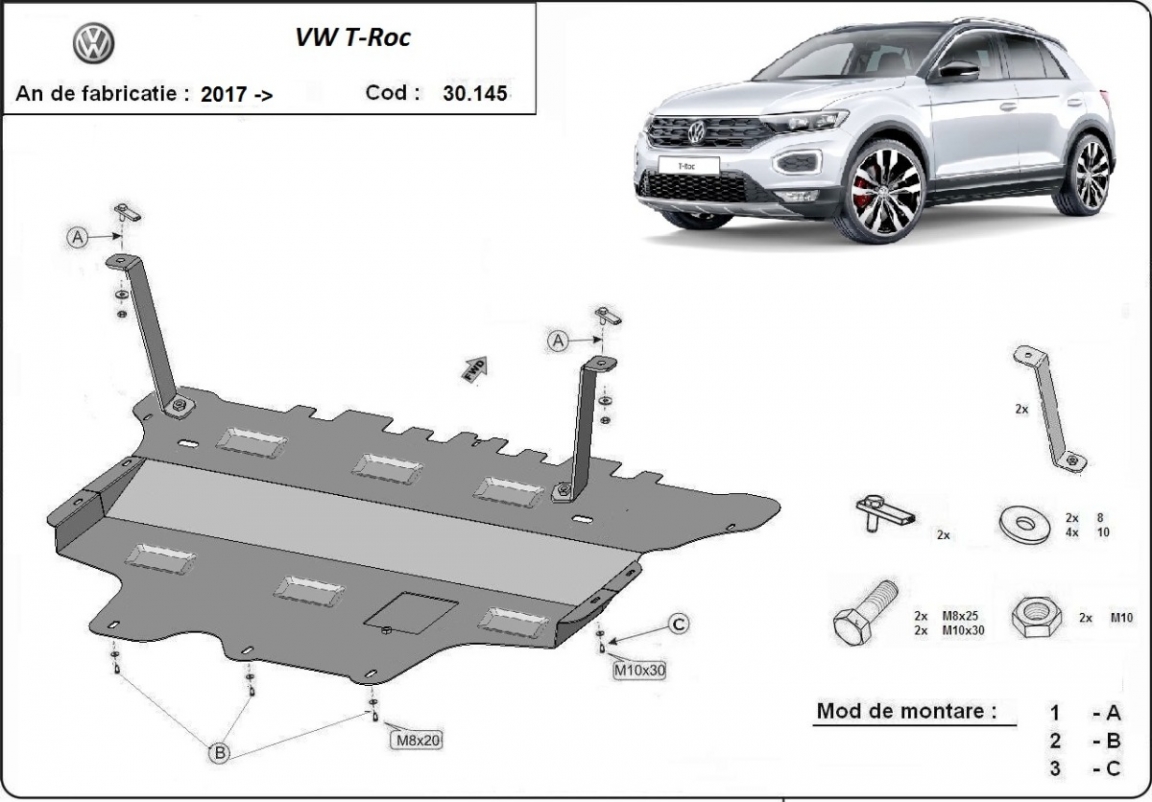 | Kryt pod motor je nová a dokonale padne pro všechny verze Volkswagen T-Roc vyrobené v letech 2017 až 2026. |
