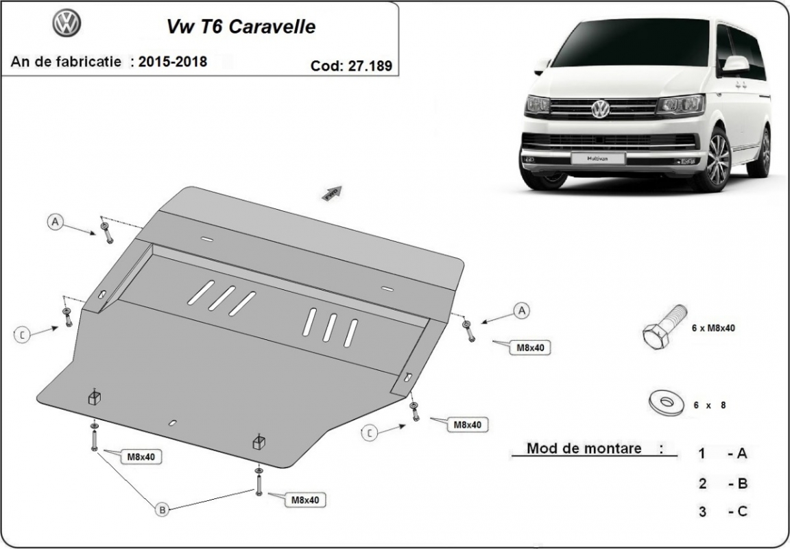 | Kryt pod motor je nová a dokonale padne pro všechny verze Volkswagen Transporter T6 - Caravelle vyrobené v letech 2015 až 2026. |