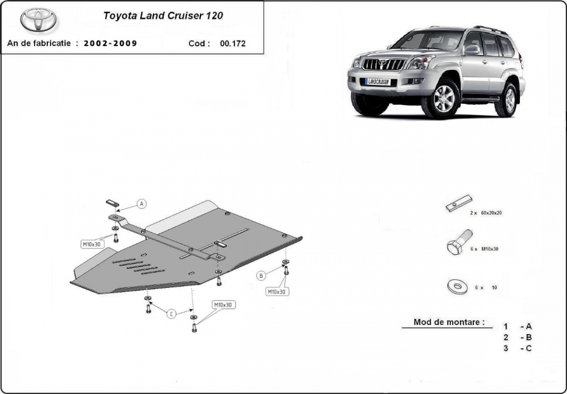 | Kryt pod motor je nová a dokonale se hodí pro Toyota Land Cruiser J120, s následujícími verzemi motor / pohon: 3.0,4.2 D - vyráběné v letech 2002 až 2009. |